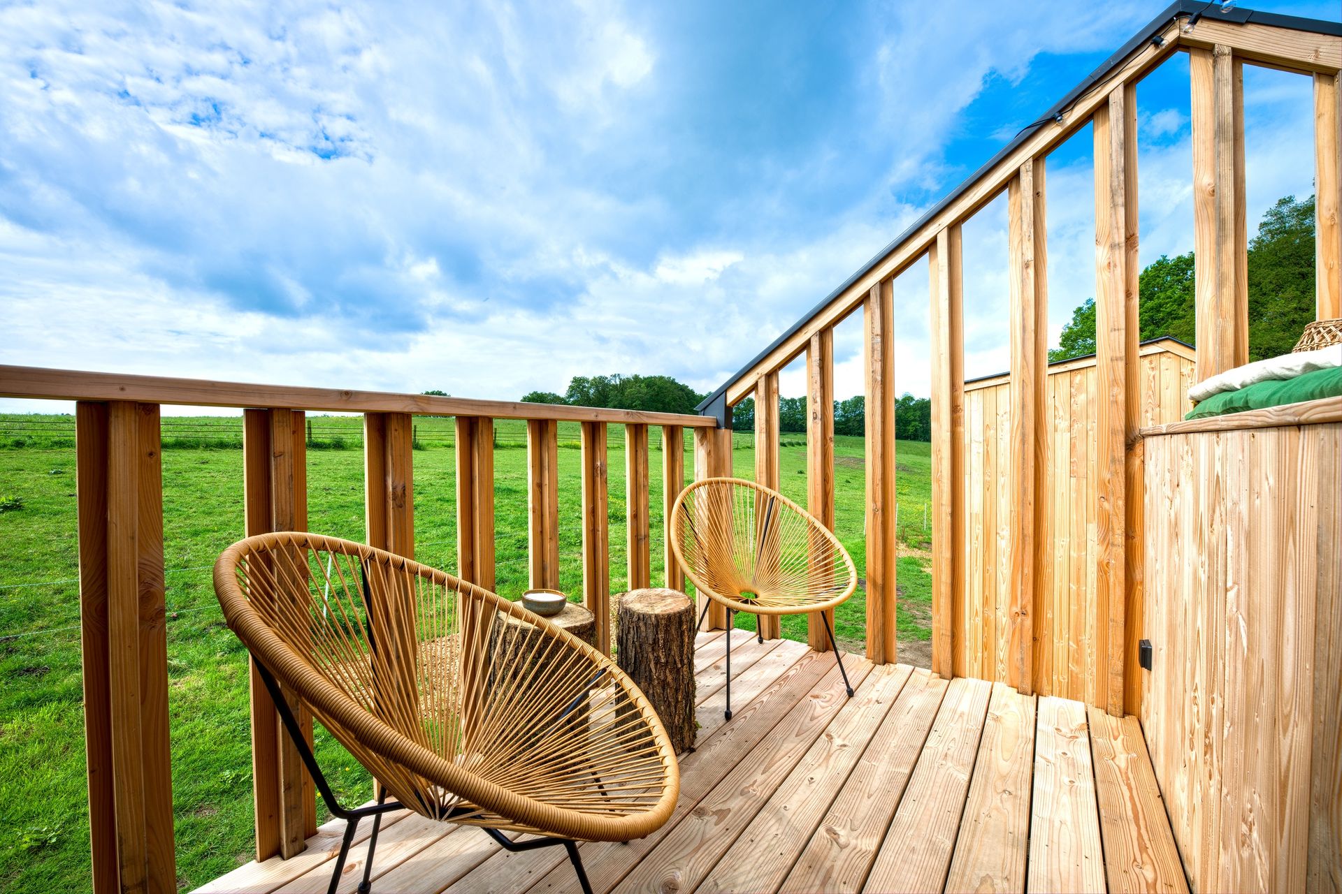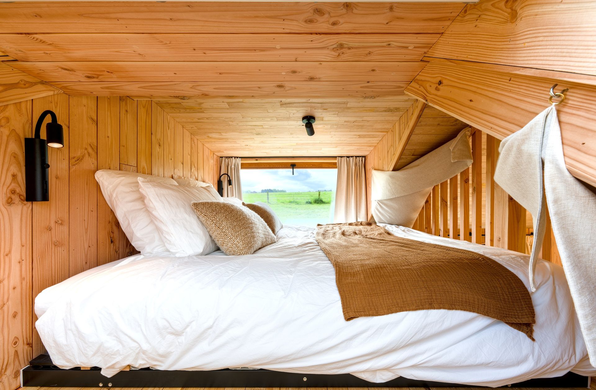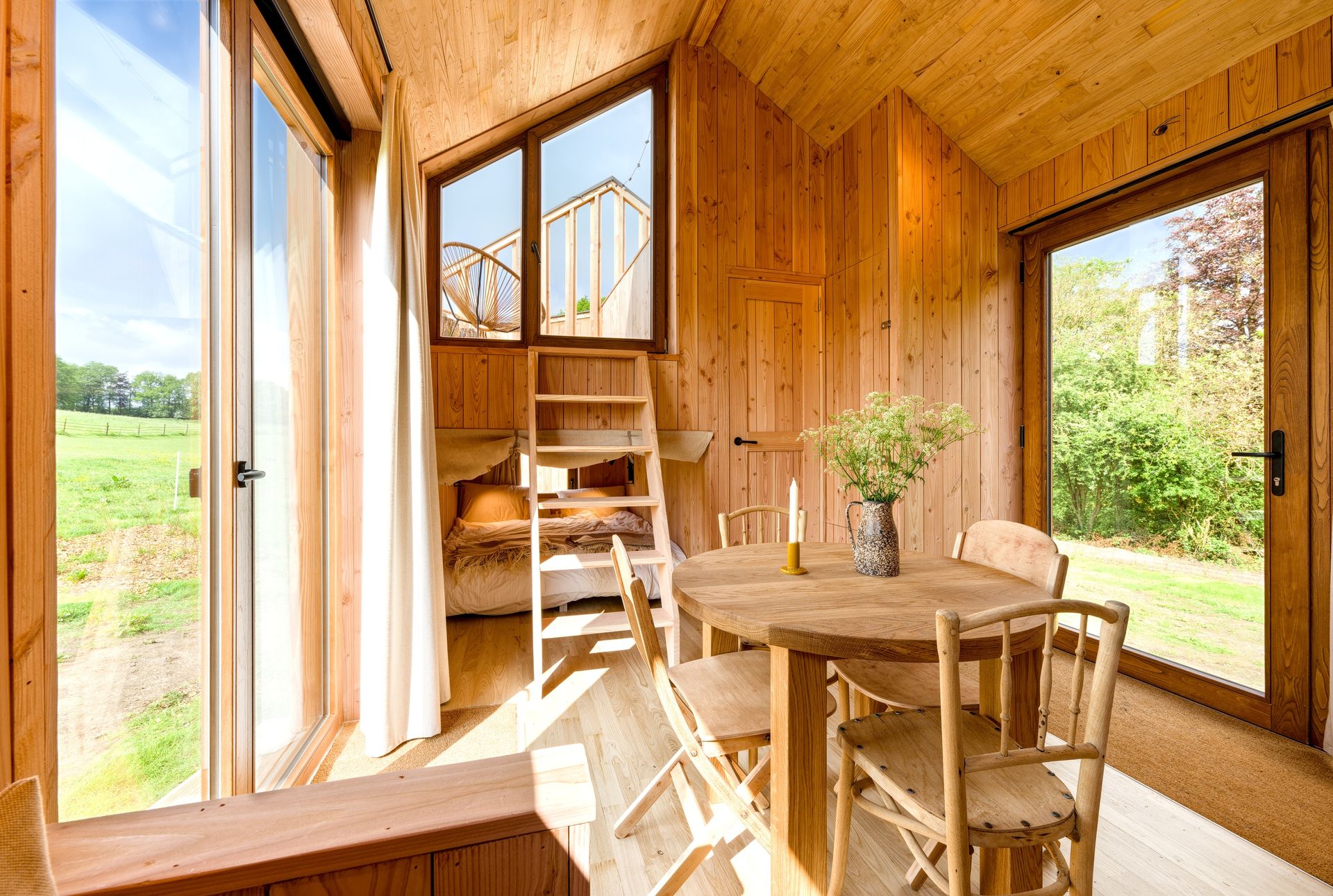 - Équipements des cabanes champêtres : lit king-size, cuisine équipée, salle de bain avec douche italienne, terrasse privée en rooftop