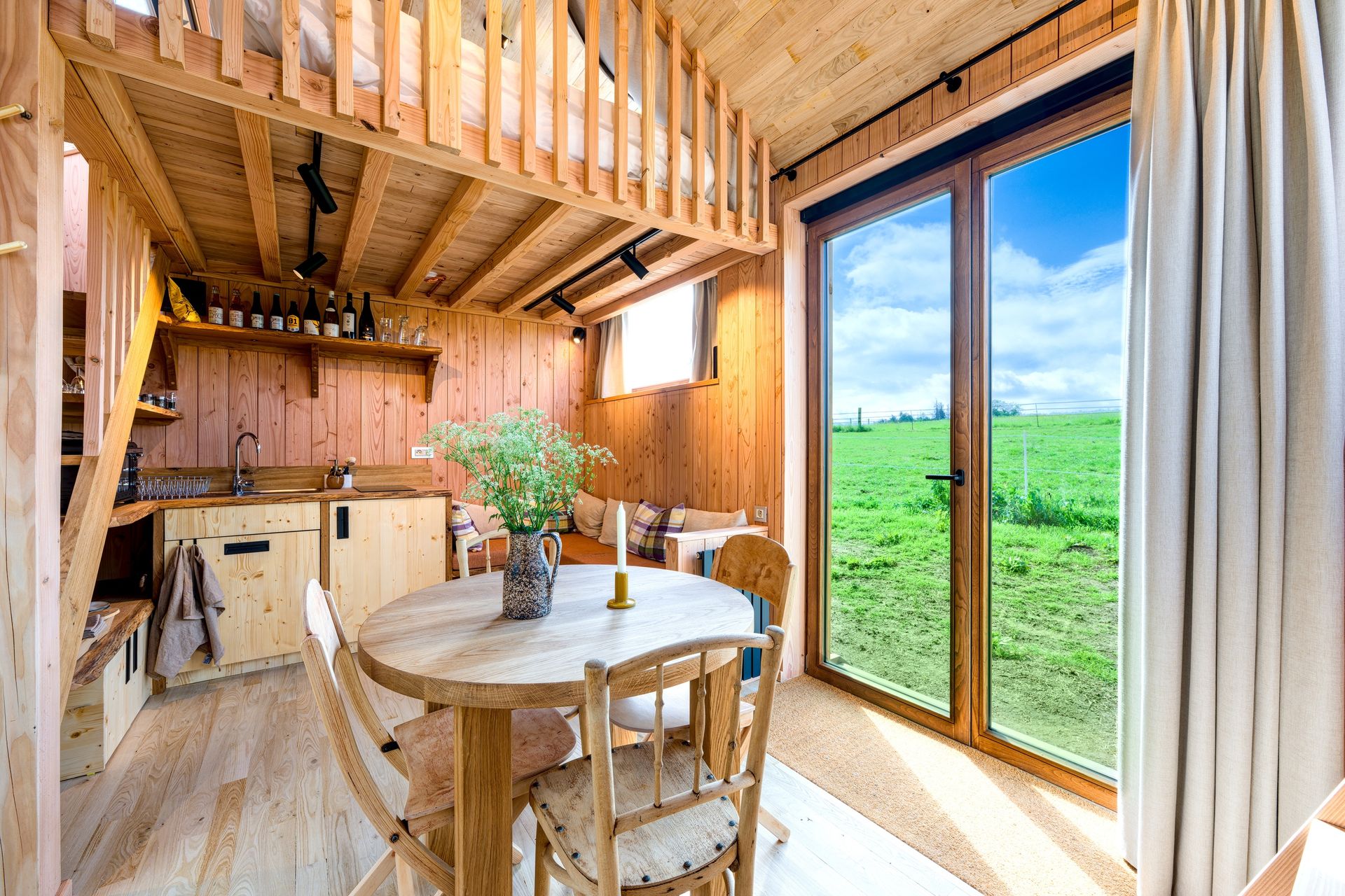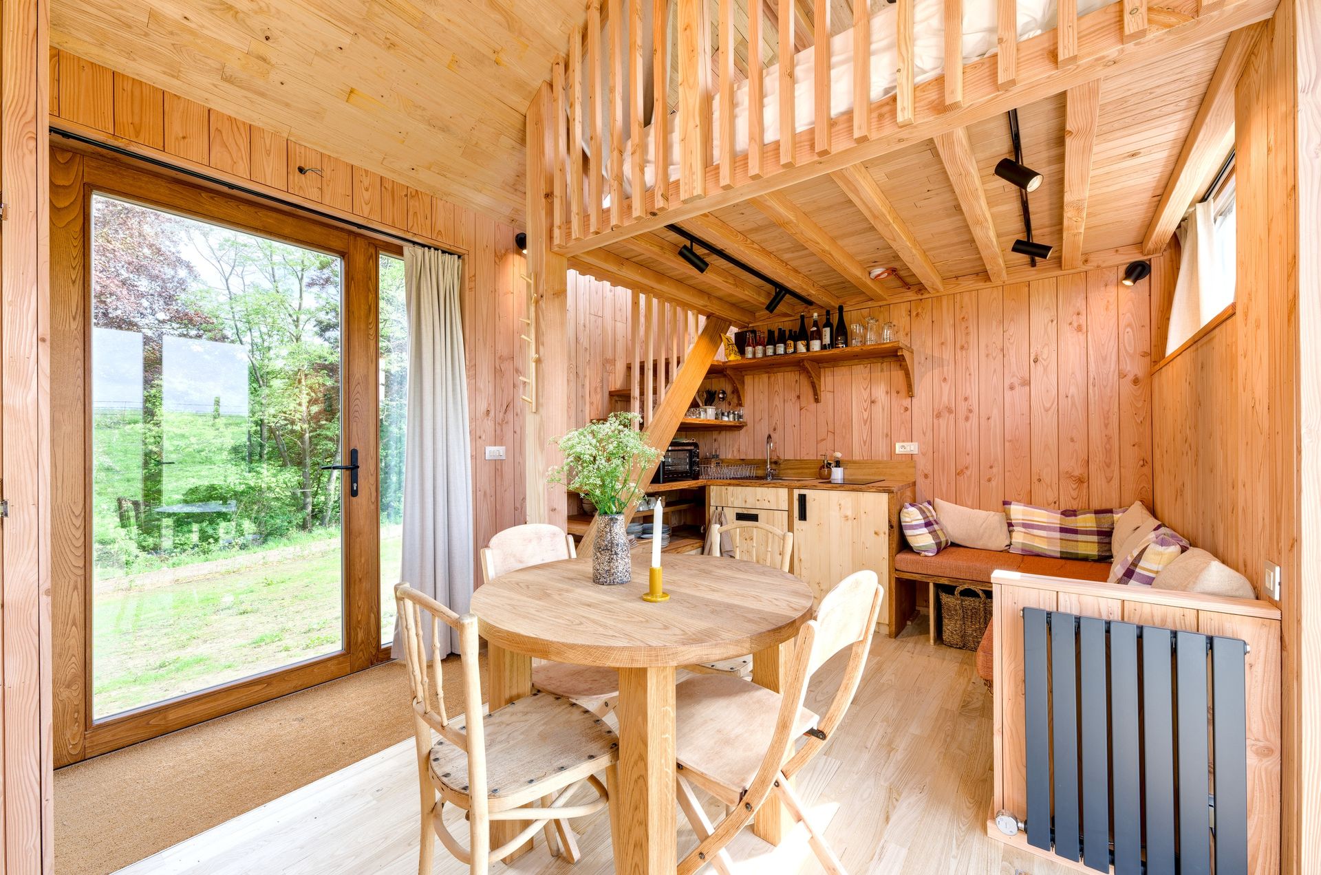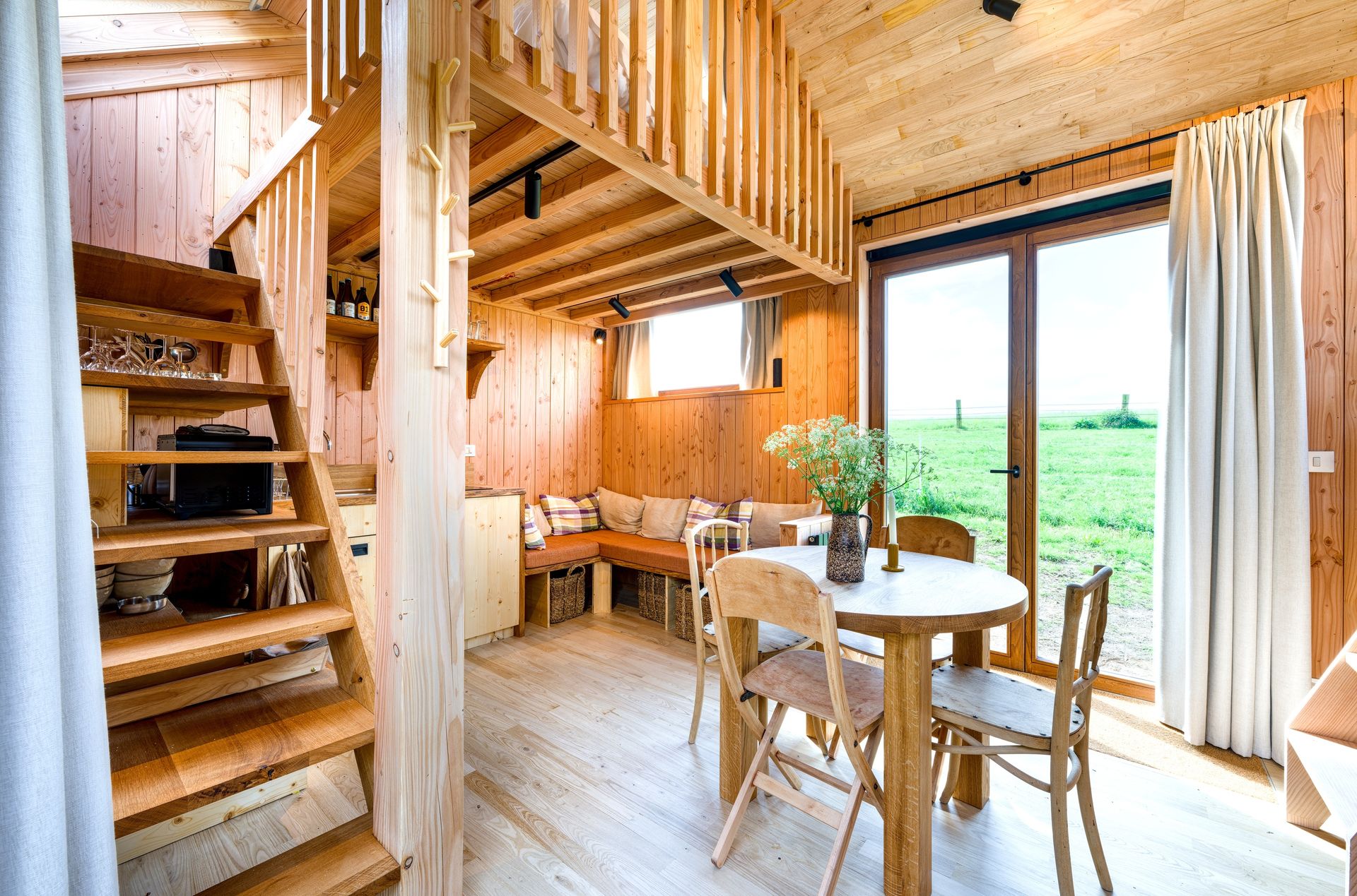 - Équipements des cabanes champêtres : lit king-size, cuisine équipée, salle de bain avec douche italienne, terrasse privée en rooftop