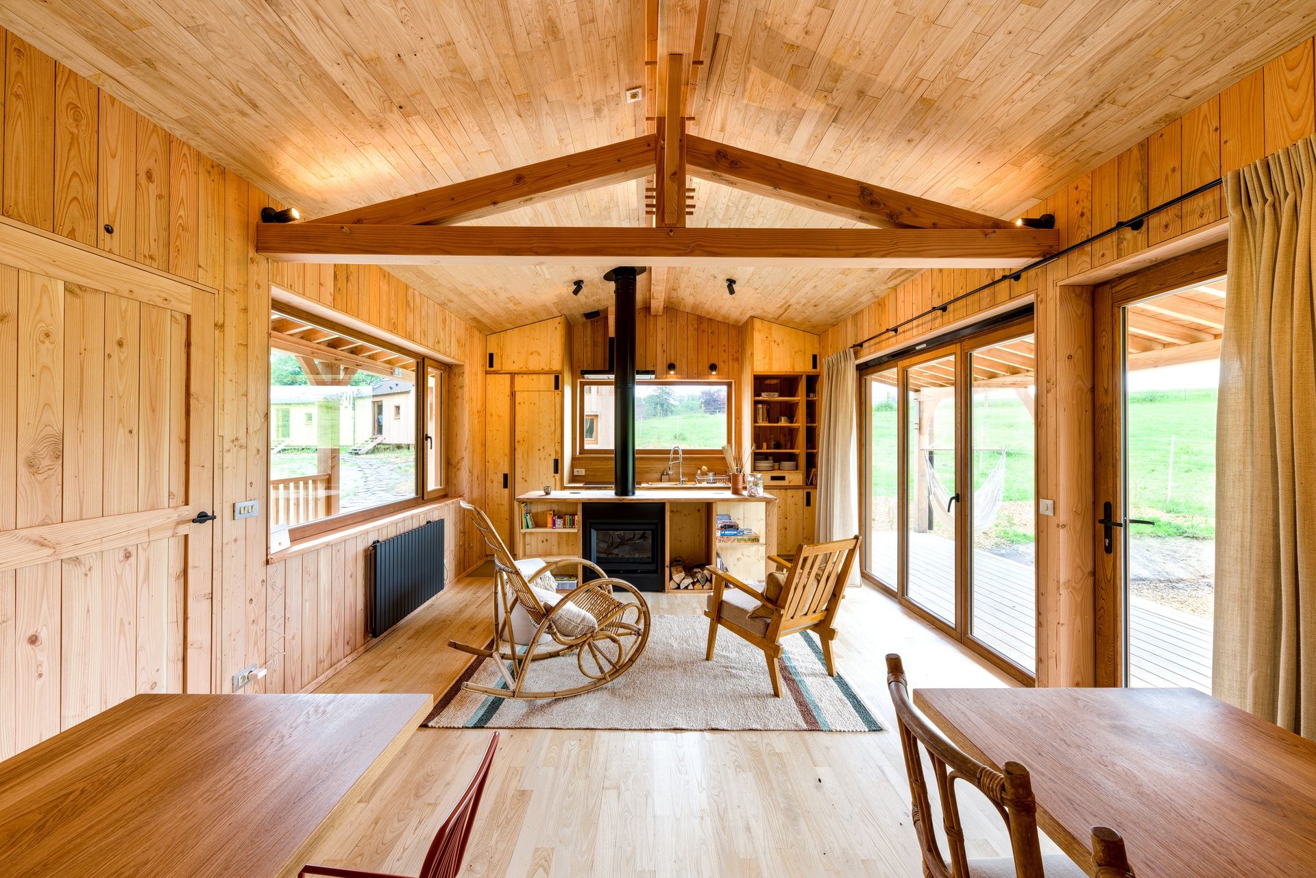 - Espace commun "Le Foyer" : grande cuisine partagée, salon avec poêle à bois, terrasse avec brasero